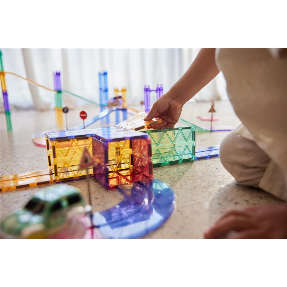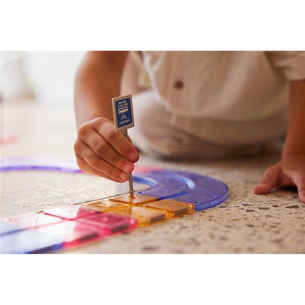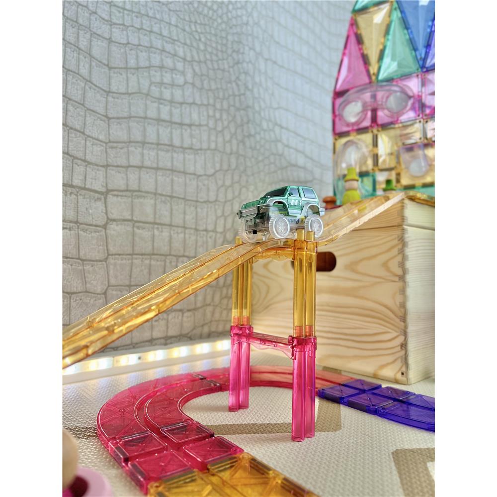 Cleverclixx Autobahn-Bausatz in Pastellfarben 80 Teile, Magnetspielzeug Rennstrecke mit Auto & Verkehrsschilder