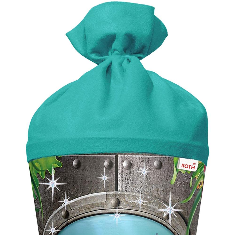 Man fühlt sich sofort wie im Bauch eines alten U-Bootes, wenn man diese Schultüte zum ersten Mal sieht. Ein gefährlicher Hai ist durch das Bullauge zu sehen, die Anspannung ist spürbar. Die Zuckertüte ist 70 cm groß, rund und mit türkisem Filz verschlossen. Die Rot(h)e-Spitze verleiht der Schultüte die benötigte Stabilität. Eine unter das Druckbild aufgebrachte Silberfolie, die nur bei bestimmtem Lichteinfall glänzt, verleiht den Effektschultüten noch zusätzliche Kraft. Für die zukünftigen Meeresforscher unter den Schulanfänger perfekt geeignet.