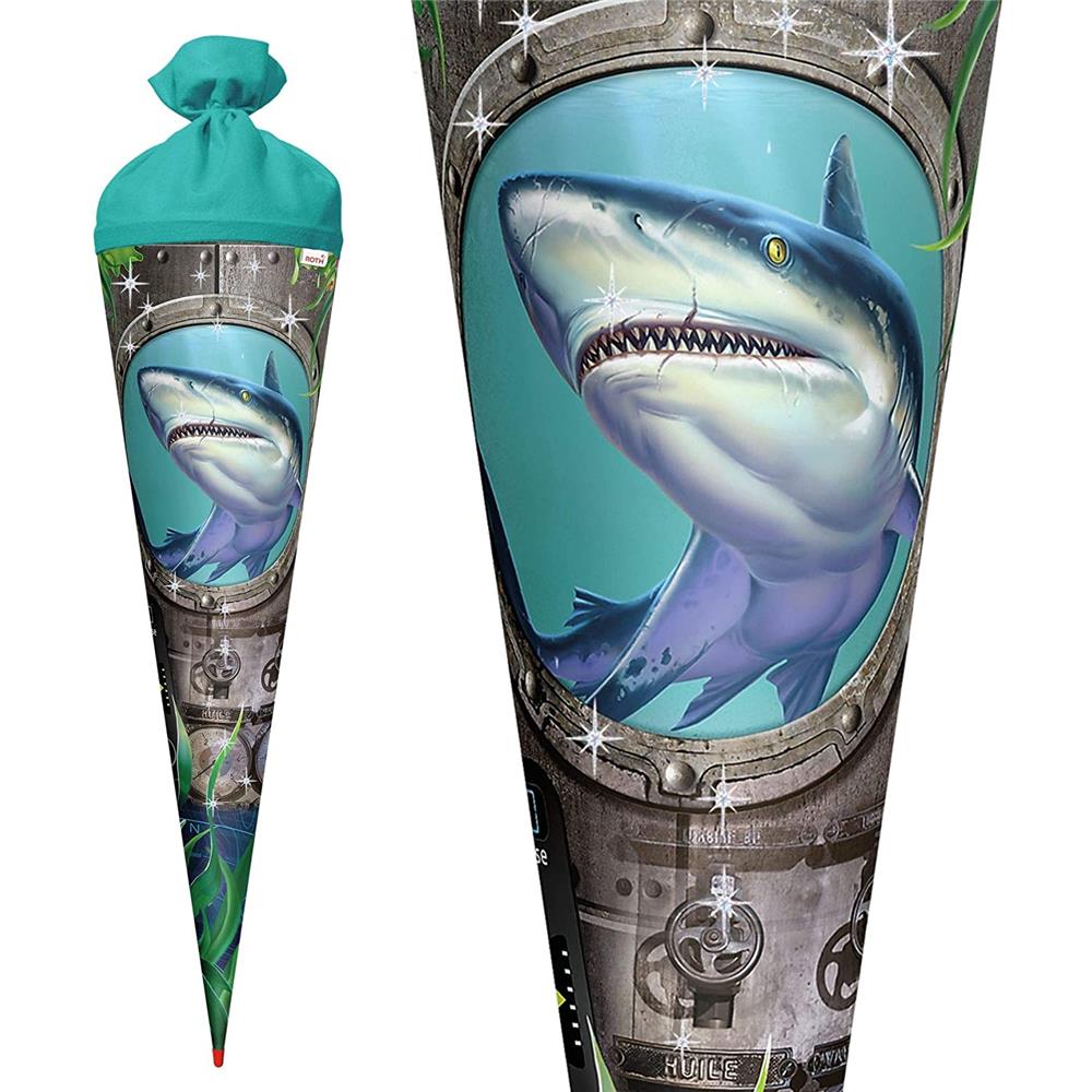 Roth Schultüte Hai, 70cm, rund, Rot(h)-Spitze, Filzverschluss, Folieneffekt