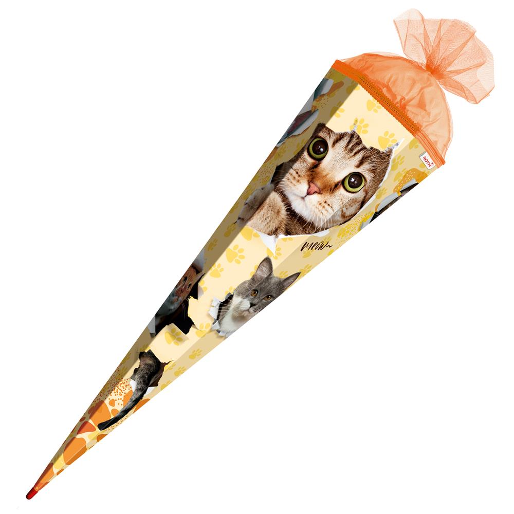 Katzen gehören nicht in die Schultüte aber darauf können es nicht genug sein. So wie bei unserer wunderschönen Zuckertüte mit den vielen kleinen und großen Katzen. Die verschiedenen Katzen in vielen Farben schauen aus dem schönen gelben Tatzen-Tapete raus. Die Zuckertüte ist 85 cm groß, eckig und mit orangefarbigem Tüll verschlossen. Die patentierte Rot(h)e-Spitze verleiht der Schultüte die benötigte Stabilität. Der tierische Begleiter wird jeden in seinen Bahn ziehen und begeistern.