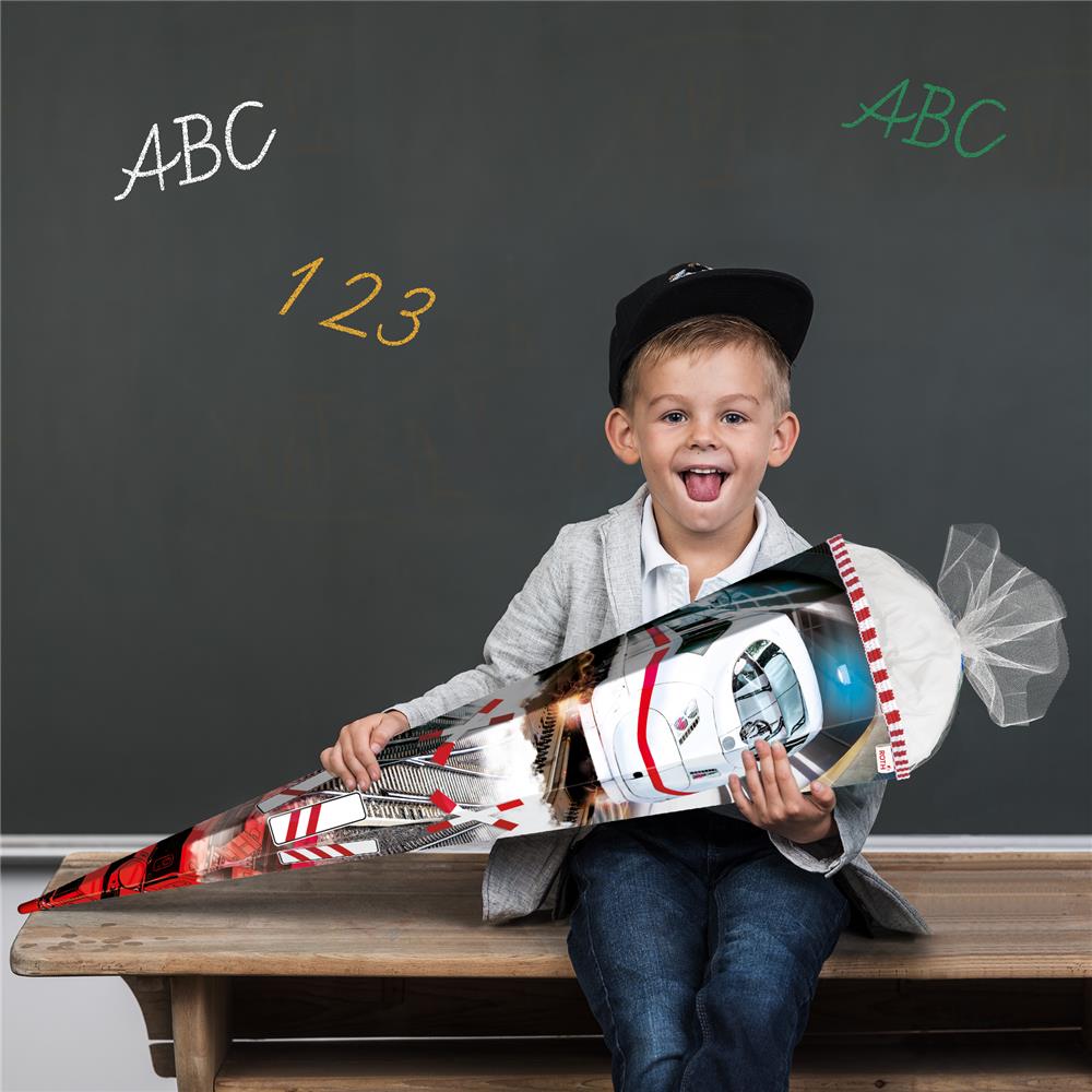 Mit diesem Schnellzug geht es für alle Schulanfänger mit Höchstgeschwindigkeit richtung Schule. Der rot-weiße Zug und die verschiedenen Bahnelemente werden durch coole Details in Rot ergänzt. Die patentierte Rot(h)e-Spitze verleiht der Schultüte die benötigte Stabilität. Die Schultüte perfekt für alle zukünftigen Zugführer.