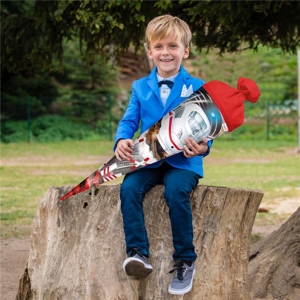 Mit diesem Schnellzug geht es für alle Schulanfänger mit Höchstgeschwindigkeit richtung Schule. Der rot-weiße Zug und die verschiedenen Bahnelemente werden durch coole Details in Rot ergänzt. Die patentierte Rot(h)e-Spitze verleiht der Schultüte die benötigte Stabilität. Der coole Folieneffekt rundet die Tüte ab. Die Schultüte perfekt für alle zukünftigen Zugführer.