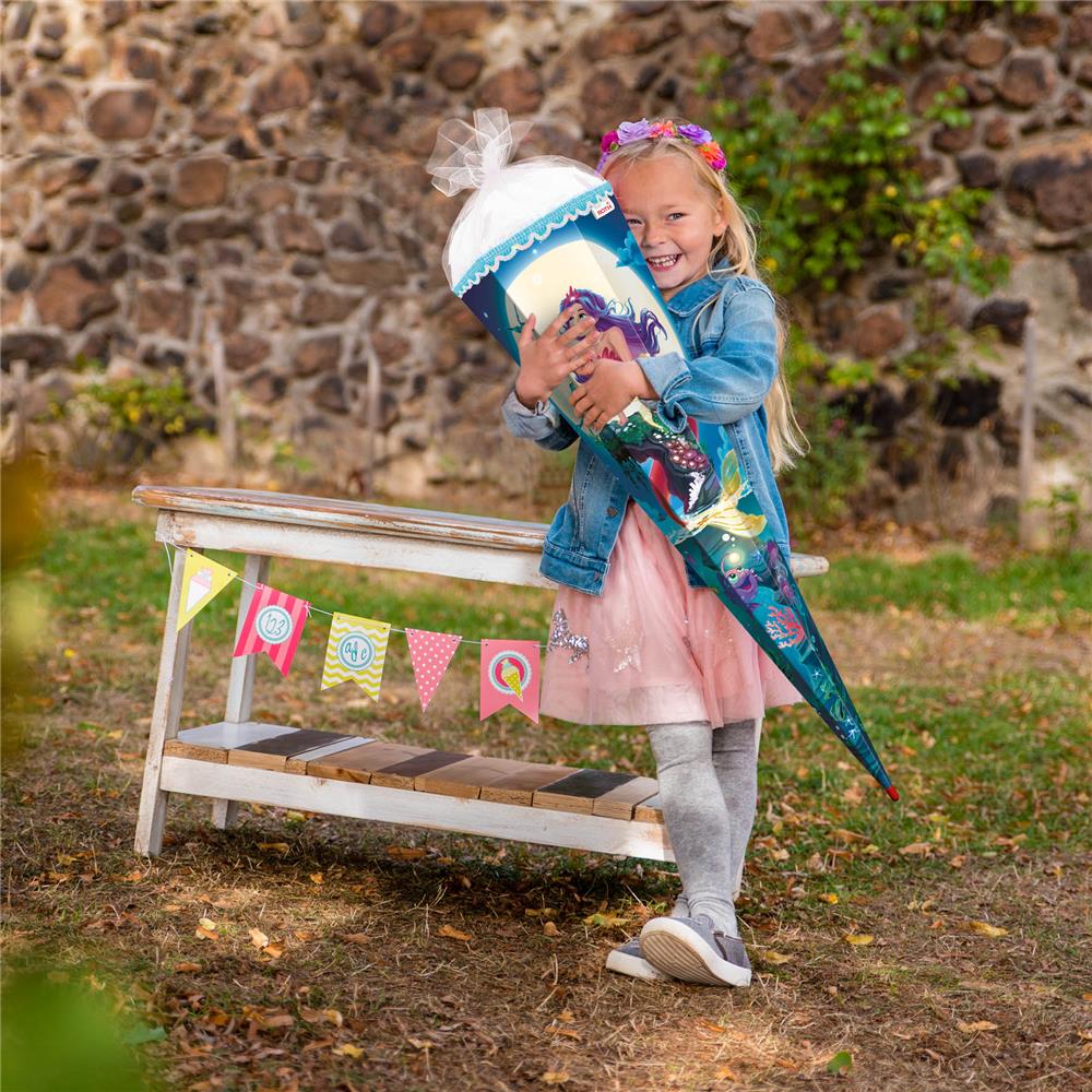 Die schöne Meerjungfrau mit wilden lila Haaren und zauberhafter roter Flosse ist umgeben von Ihren fantastischen Tierfreunden aus Wasser und Land. Der mysthische Vollmond mit vielen Sternen sorgen für ein geheimnisvolles Funkeln der Schultüte. Die Zuckertüte ist 85 cm groß, eckig und mit weißem Tüll verschlossen. Die Rot(h)e-Spitze verleiht der Schultüte die benötigte Stabilität. Eine glitzernde Borte mit Pailletten und der Folieneffekt bilden das i-Tüpfelchen. Dieses Schultüte wird alle Kinder in Ihren Bann ziehen.