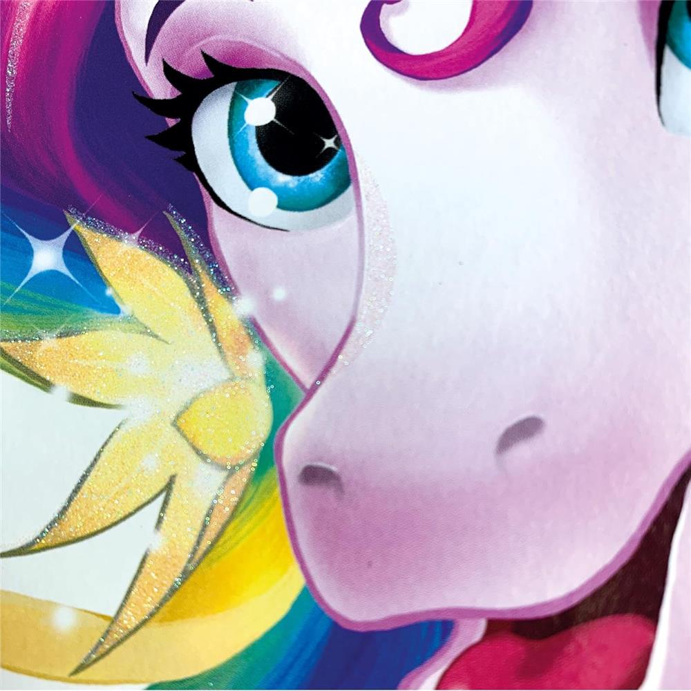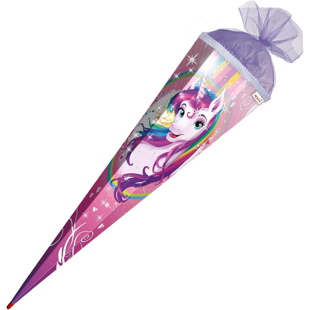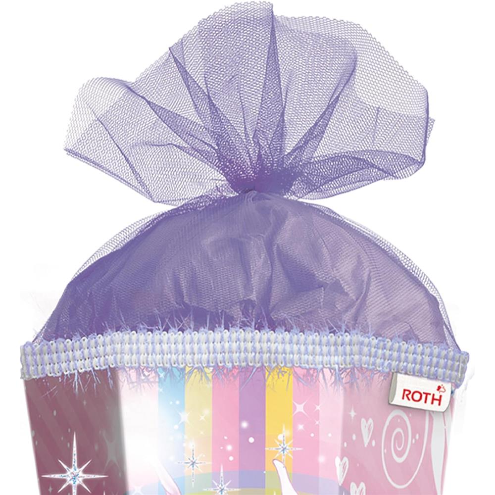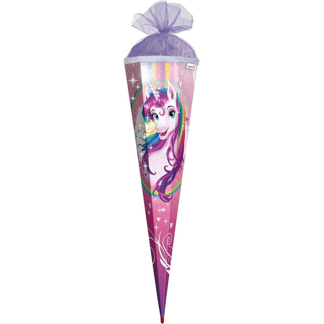 Roth Schultüte Einhornportrait mit Glitter, 85cm, eckig, mit Rot(h)-Spitze und lila Tüllverschluss